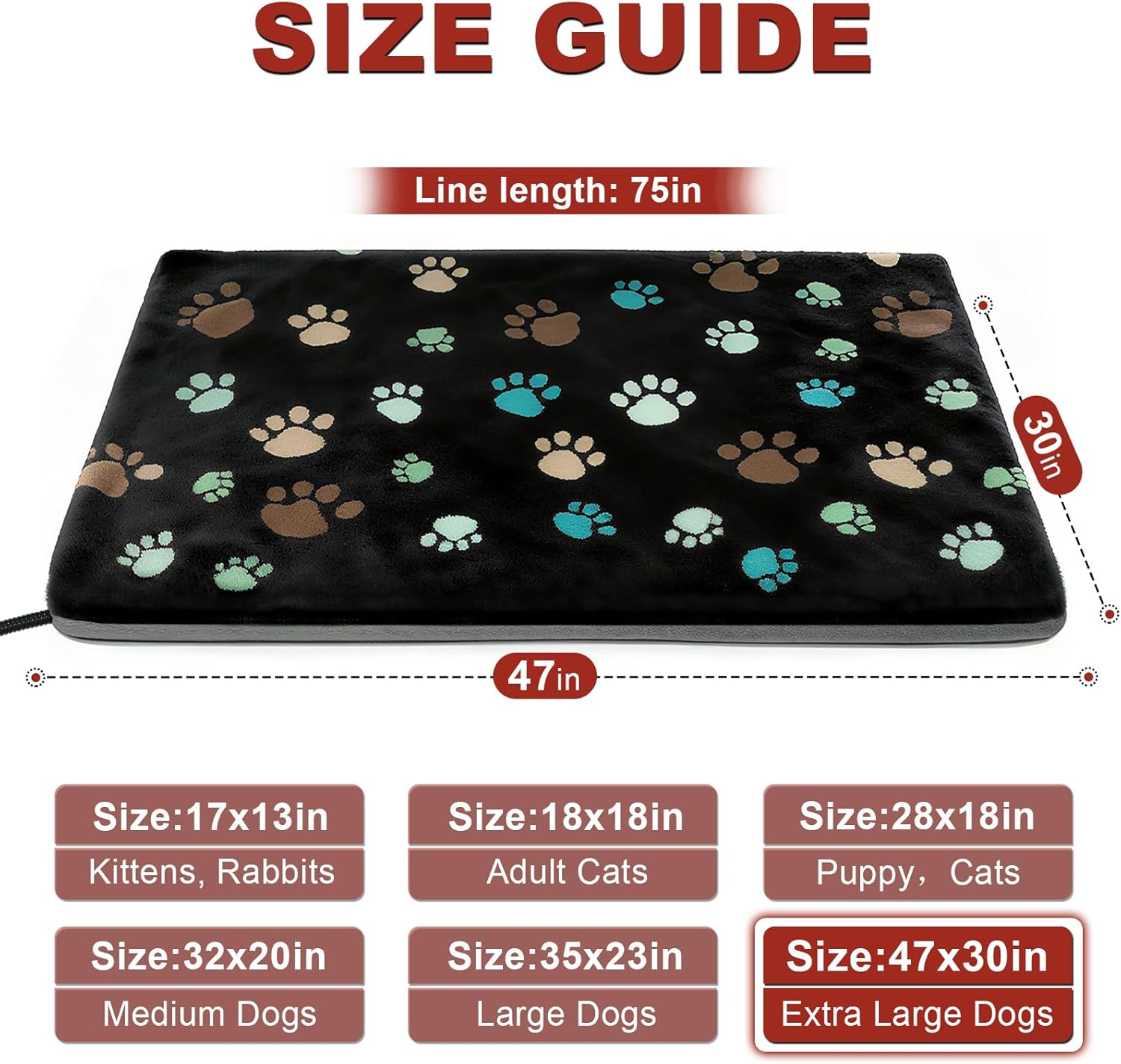 - UPGRADED CONFIGURATION:Extra Large Dog Heating Pad 47 x 30 inches (for adult extra large dog breeds, such as Central Asian Shepherd, Newfoundland, Caucasian, Greyhound, Labrador, etc.) With smart controller + built-in multiple thermostat sensors, reinforced power cord connection ports + protected wire rope for extra safety. Comes with a super soft cloth cover