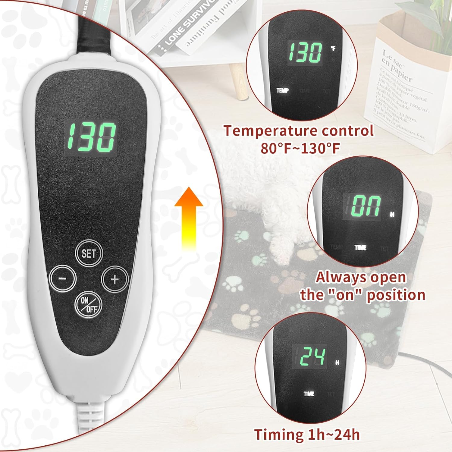 - INTELLIGENT CONTROLLER: our pet heating pad can set the temperature freely (increase 5℉ per level), provide 80-130℉, 1-24 hours free choice of on time duration, can be turned off automatically. Newly added “always on” mode.
